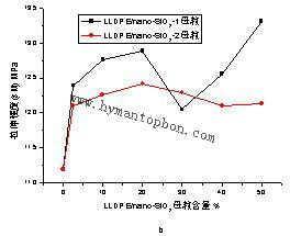 将制备的母粒LLDPE/nano-SiO2-1LLDPE/nano-SiO2-2分别按不同比例加入高压聚乙烯LD607中,注塑机注塑成70mm*10mm*4mm的拉伸样条,样条中纳米SiO2的最终质量含量为0.5%2%4%6%8%10%。样条拉伸强度按GB/T 1040-1992测试,拉伸速率为10 mm/min
